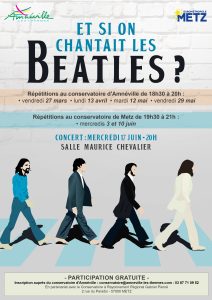 Vous êtes fan des Beatles et adorez fredonner leurs airs les plus connus ? Et si en plus vous vous appelez Michelle ou Jude « Come together » et rejoignez le chœur éphémère du Conservatoire Municipal de Musique et de Danse d’Amnéville pour participer au projet inédit « Et si on chantait les « Beatles ».
