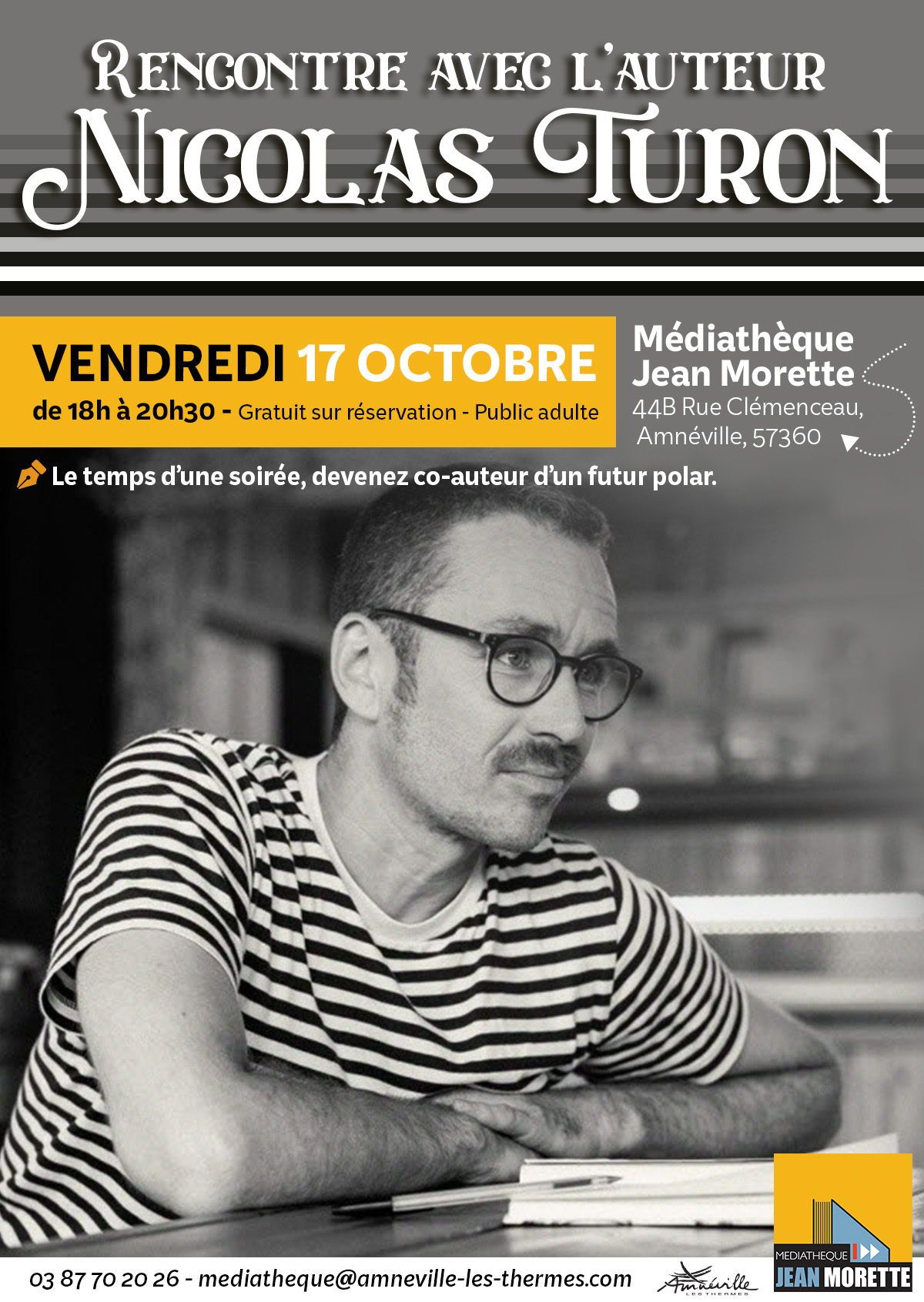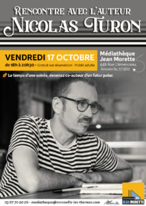 Cela sera possible le 17 octobre – Nicolas Turon vous attend à la Médiathèque Jean Morette d’Amnéville dès 18h à l’occasion du lancement de l’écriture de la prochaine nouvelle de la collection «Mortelle Moselle».