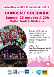 Le samedi 25 octobre, la salle André Malraux accueillera un concert solidaire unique réunissant la chorale Le Virelai et Les Seigneurs de l’harmonica de l’école de musique GregZlap de Terville.