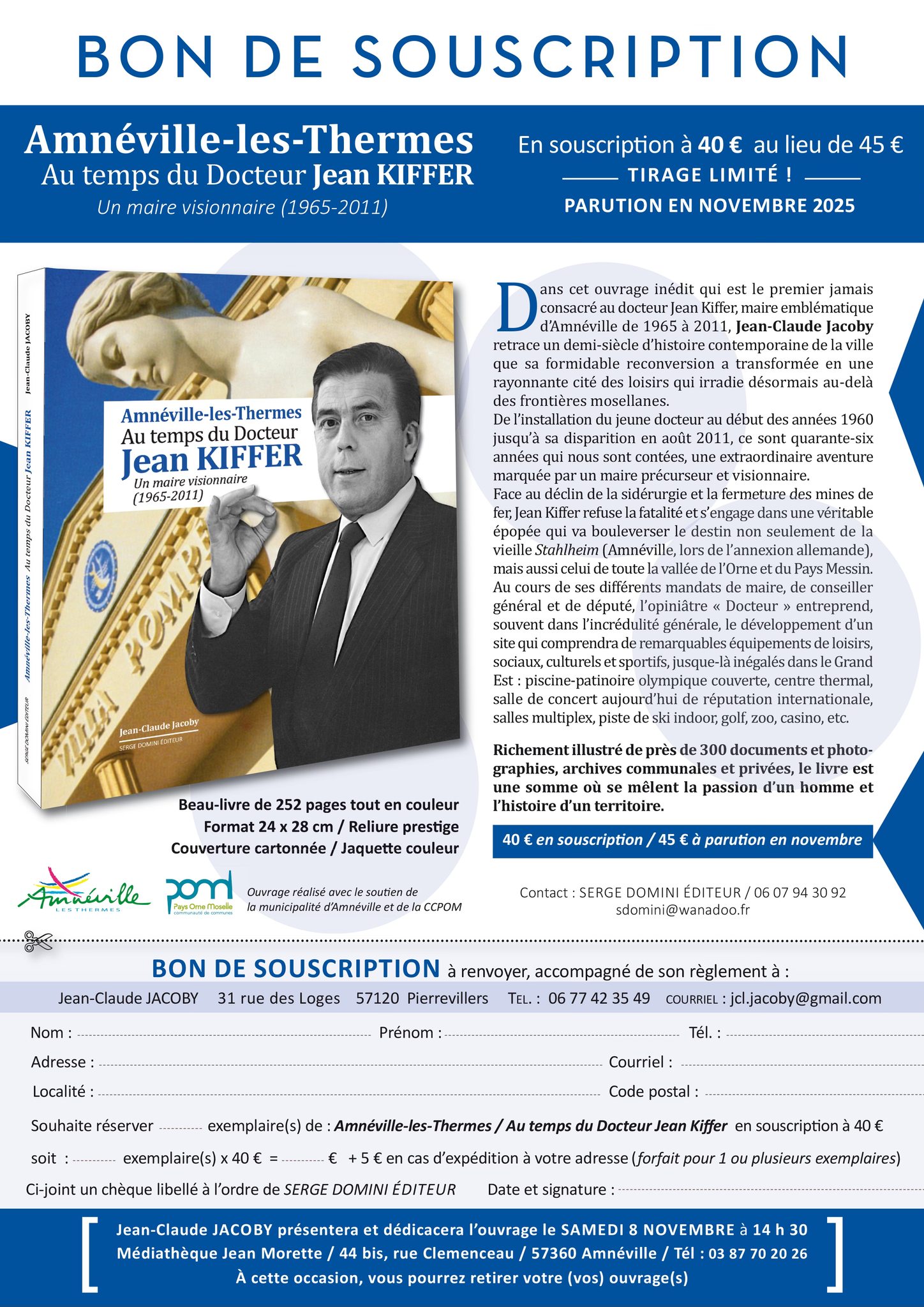 C’est à la Médiathèque Jean Morette que Jean Claude Jacoby présentera et dédicacera son ouvrage « Amnéville-lès-Thermes au temps du Docteur Jean Kiffer » le 8 novembre à 14h30.